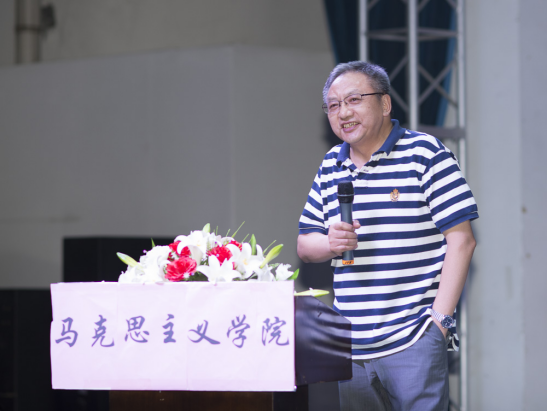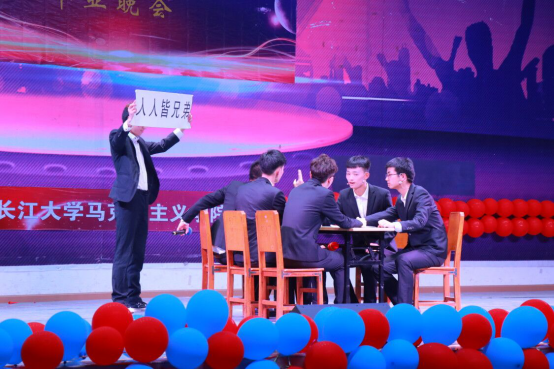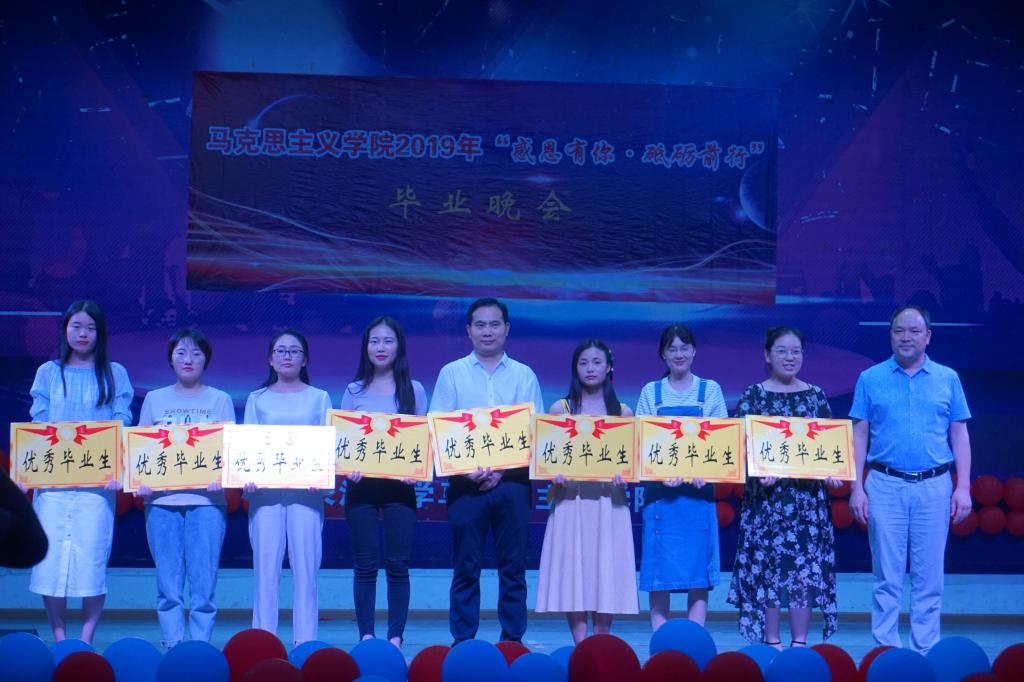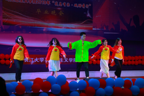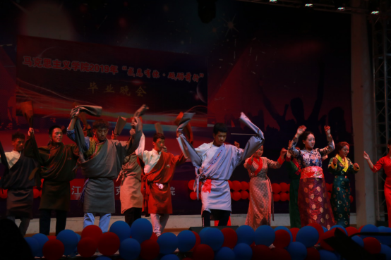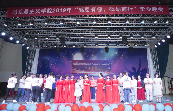 表彰大会结束后,动感火热的开场舞《DALLA DALLA》点燃了毕业晚会。《我的新衣》将现代说唱与传统京剧相融合,使人耳目一新;现代舞《pick me up》、《heart shaker》清纯可爱,活力无限;民族舞《女儿会》、《锅庄风情》柔婉袅娜、质朴潇洒,赢得现场阵阵掌声;歌曲《私奔到月球》、《不为谁而作的歌》温柔甜美、娓娓动听,让人赏心悦耳;《创意T台秀》和相声《我说了算》多元创新、包袱连连,让人忍俊不禁,掌声不断。贾廷秀教授指导的暖课作品《以青春致敬马克思》也再次搬上了毕业晚会的舞台,思政2017级的同学们用话剧的形式展现了青年马克思的雄才伟志,以及他与恩格斯的深厚友谊;肖芬蓉老师的女儿班传珮小朋友也献唱了让人倍感清新流畅的民谣《卢沟谣》;思政11602班的朗诵《不说再见》,追忆了大学时光的点点滴滴,表达了他们对学长学姐的感恩与不舍;毕业班的情景剧《长大,长大,再见》压轴出场,一幕幕情景剧记录了2019届毕业生在长大、在马院难忘的青春岁月,引发了师生强烈共鸣。最后,贾廷秀等7位麻豆社