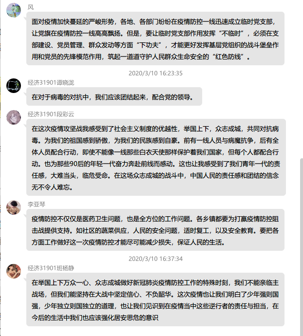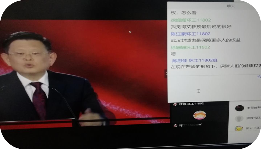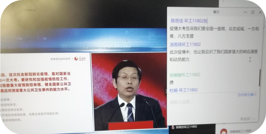 在观看了“思政大课”后,思政课教师利用上课时间,有序开展线上讨论。老师首先回顾了四位老师的讲授要点,并结合四门思政课的知识点,进行了知识拓展和主题深化。随后由同学们发表自己的感想。同学们讨论热烈,普遍表示,通过观看“思政大课”,结合自己在疫情期间的切实体验,更深刻地认识到了中国共产党的领导以及中国特色社会主义制度的充分优势,尤其是在与欧美国家的疫情表现的比较中,同学们感受到了社会主义制度的巨大优越性,中国共产党的先进性,同时也意识到了作为青年大学生,肩负着重要的责任。学生的具体反响如下: