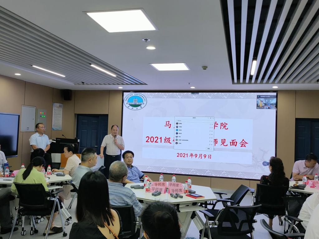 的硕士生导师一一作出介绍。其次,姜学勤院长向2021级硕士研究生新生致辞,提出了四点期望:一要尽快适应,及早规划。尽快适应新的学习模式,对研究生毕业后的职业进行规划。二要聚焦主业,勤奋学习。端正学习态度,正确掌握学习方法,把学习当成一种生活习惯、行动自觉。三要强健体魄,砥砺意志。鼓励同学们积极参加各种体育锻炼,在锻炼中强健体魄、砥砺意志、成长成才。四要善于沟通,和谐人际。要善于与别人沟通,注重修身养性,妥善处理好与室友、同学、导师的关系,努力构建和谐的人际关系。再次,硕士研究生导师代表黄晓云副教授对2021级硕士研究生新生强调:一定要多读原著,善于发现问题,不断进行理论和实践创新,走创新型研究路线。最后,2020级硕士研究生的优秀代表张夕雨、刘佳依次发言,给师弟师妹们了一些读研的经验和学习规划;2021级硕士研究生新生代表张丽莉、古力齐克热·努尔东相继发言并表示自己一定会好好学习并继承马院的优秀学风,做一名优秀的研究型人才。会后,学院的导师们一一向同学们赠礼并合影留念。
