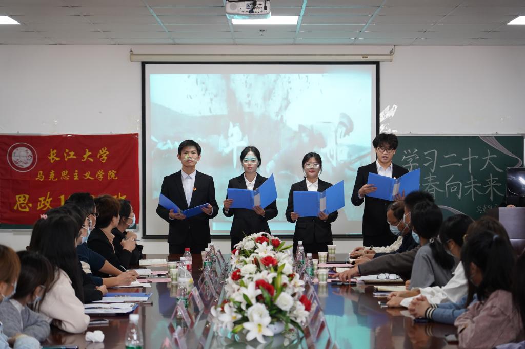 诗朗诵《红船,从南湖起航》,赞共产党百年来踔厉奋发、勇毅前行的光辉历程,扬帆起航谱新篇;抒青年学子自立自强、笃行不怠,守正创新向未来。主题发言环节中,两位学生代表结合二十大报告内容,交流学习体会。“作为当代青年,我们生逢其时,重任在肩。”杨杰从投身志愿服务的所见、所做、所感中深刻领悟到服务他人、奉献他人的价值所在,她立志发挥专业优势,使青春之花在奉献中绽放;“我们要怀抱梦想又脚踏实地,敢想敢干又善作善成。”王茹与大家分享在学院青马学习小组的心路历程,并鼓励同学们在求知的课堂上认真学习,为成为有用人才打下坚实的文化基础。