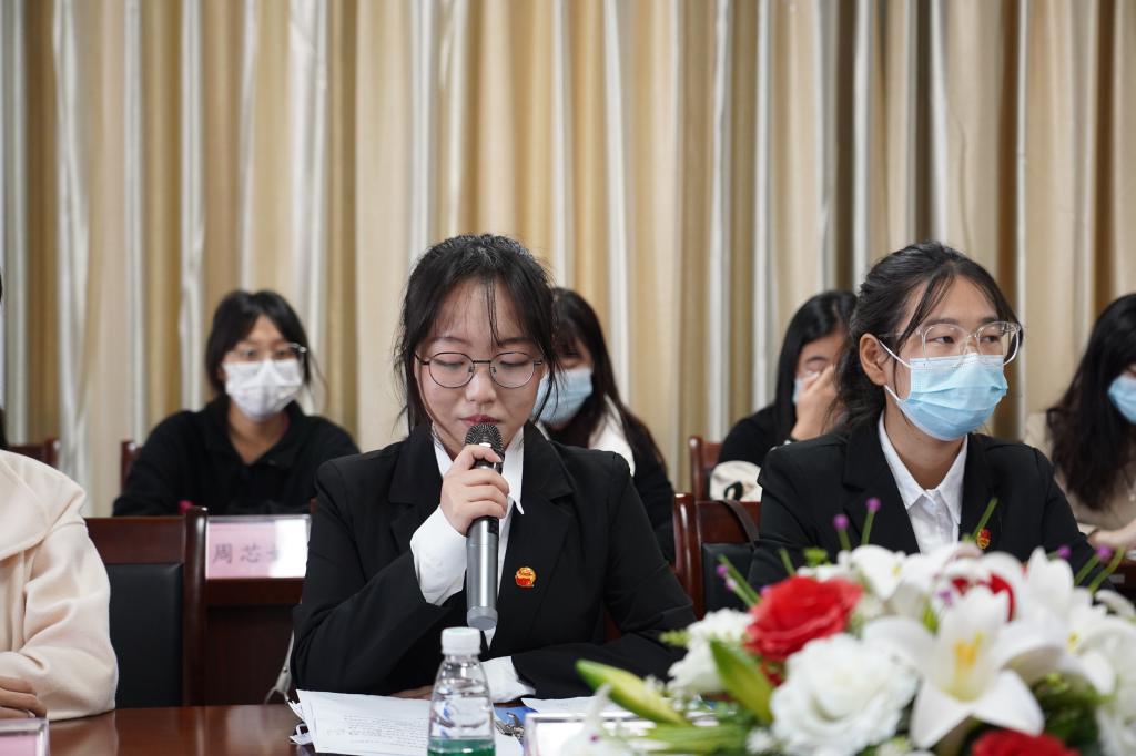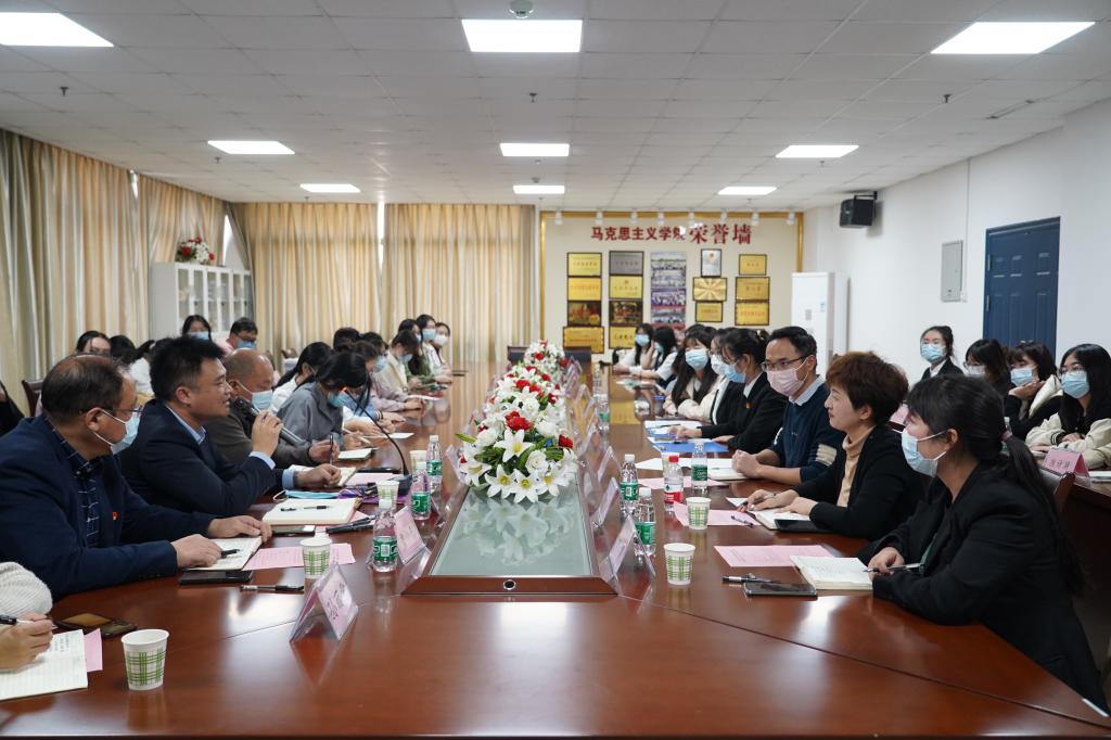 马书记首先对后勤集团领导们的到来表示欢迎,并畅谈活动感受。她认为本次活动内涵有三:是一次及时的学习交流会。马书记指出,身为马院学子、共青团员,加强对党的二十大精神的学习是必须的、必要的,她要求同学们持续学习贯彻党的二十大精神,明确青年人的理想、使命与担当;是一次有意义的支部主题团日活动。看到班级同学精心准备,马书记不吝赞美,赞微党课形式新颖、寓教于乐,将传统的学、读、讲形式加以创新,带领同学们学新知、理思路,将知识用到了实处;是一次有温度的座谈交流会。她用“很温暖、很感动”表达了座谈感受,感谢后勤保障部对马院学子的关心,期待能有更多交流活动。