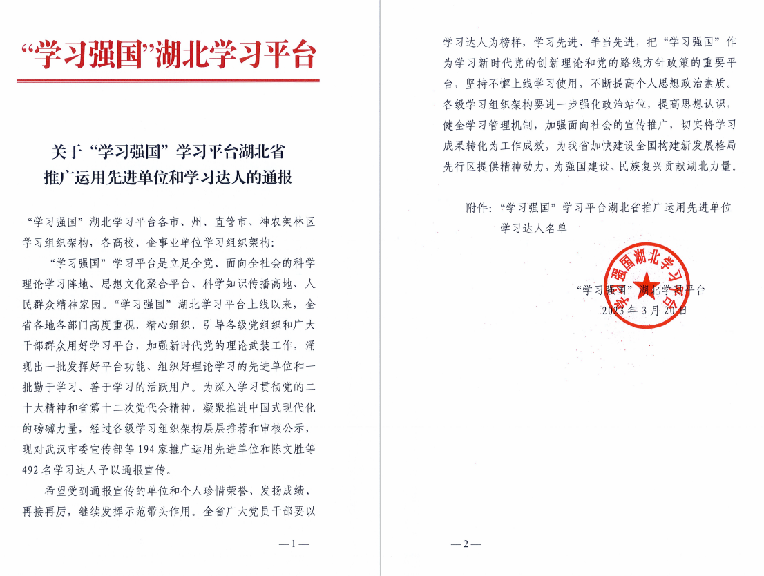 近日,湖北省委宣传部表彰了一批 “学习强国”学习平台推广运用先进单位和学习达人,麻豆社