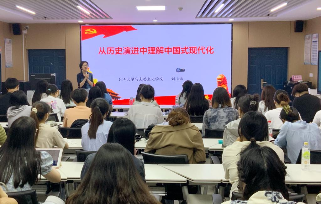 “是时势造英雄,而非英雄造时势。”围绕《从历史演进中理解中国式现代化》这一主题,刘书记以民营企业家的发展兴衰为例,强调了作为青年人要用心感受时代脉搏,研读好党的二十大报告。她从历史渊源、中心任务、中国特色、本质要求、战略安排等七大方面阐释中国式现代化的内涵,以多维视角解读中国式现代化。刘书记强调:“中国式现代化是前无古人的现代化,这就要求我们要守正而创新。”解读中国式现代化既要把握它的历史渊源,又要明晰它的理论支撑,更要联系实际。随后,刘书记带领同学们从世界现代化发展历程看中国现代化,明确了科技和产业革命是现代化的动力,分析了先发与后发现代化国家的优与劣、现代化的道路异与同,并以新加坡为例,指出民主国家想要发展,就要坚定“走自己的路”。而中国想要发展,就要走出中国自己的现代化道路。中国式现代化是人口规模巨大的现代化,是全体人民共同富裕的现代化,是物质文明和精神文明相协调的现代化,是人与自然和谐共生的现代化,是走和平发展道路的现代化。中国式现代化更是需要全体人民、青年人共同参与的现代化。