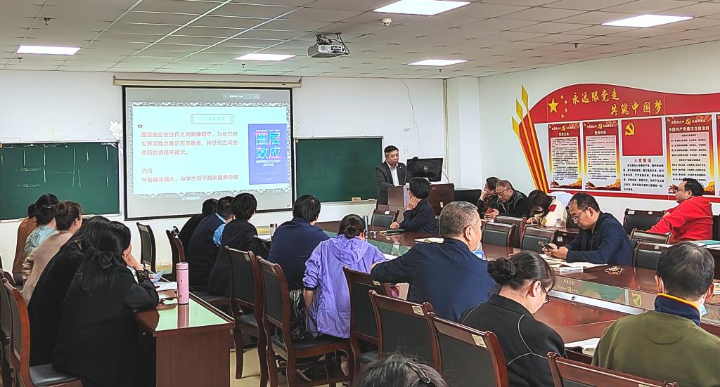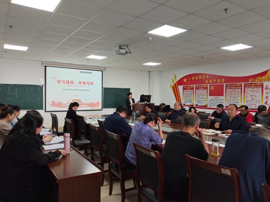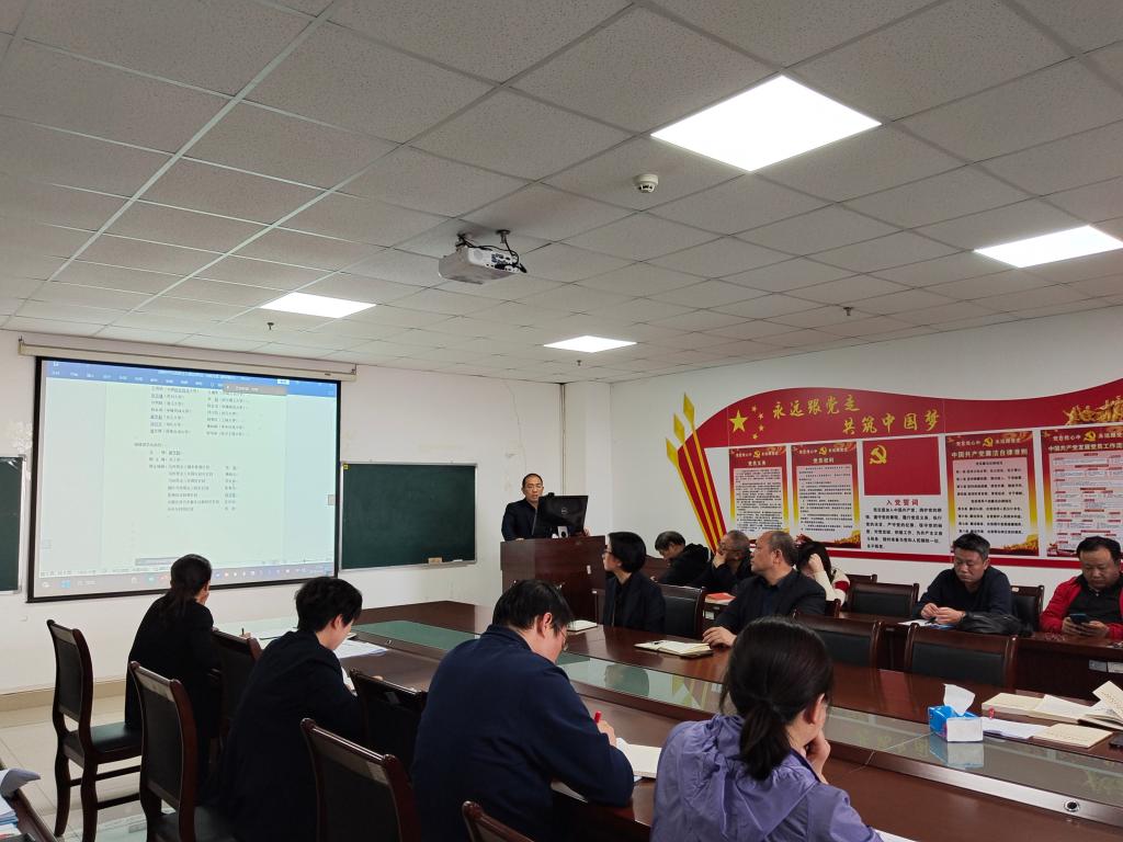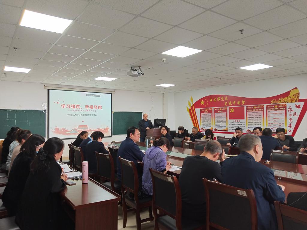 在文科楼1104室召开本月教职工大会,全院教师以线上线下相结合的方式参会。会议由院长姜学勤主持。