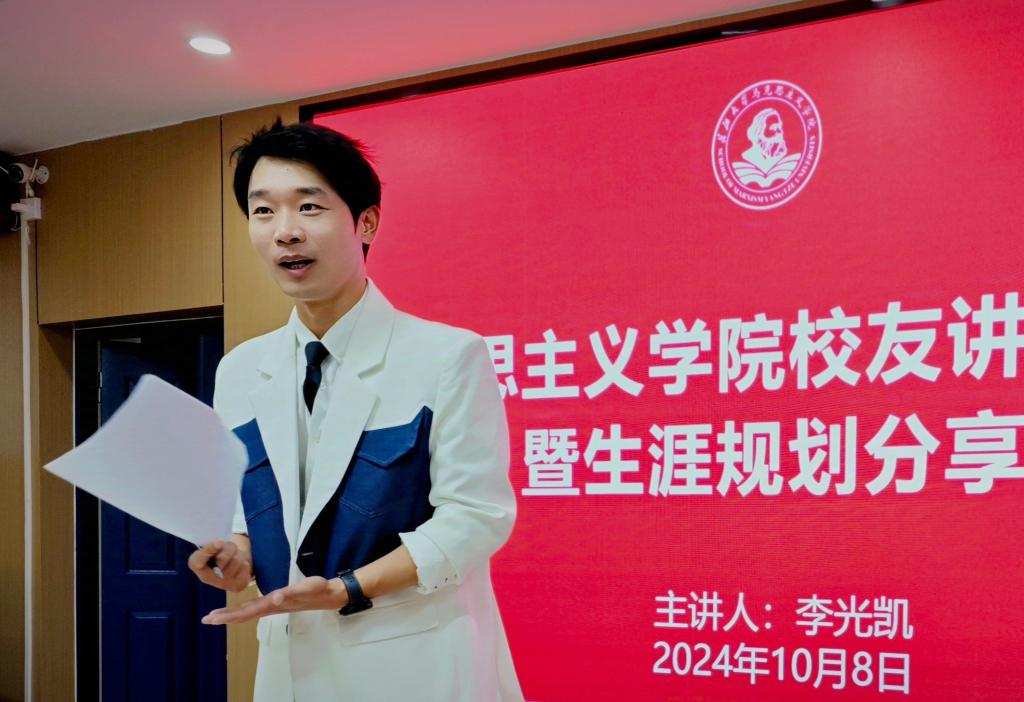 在文科楼1008室举办校友讲座第三讲暨生涯规划分享会,受邀进行分享的校友是经济与管理学院国际贸易专业2008级毕业生李光凯。