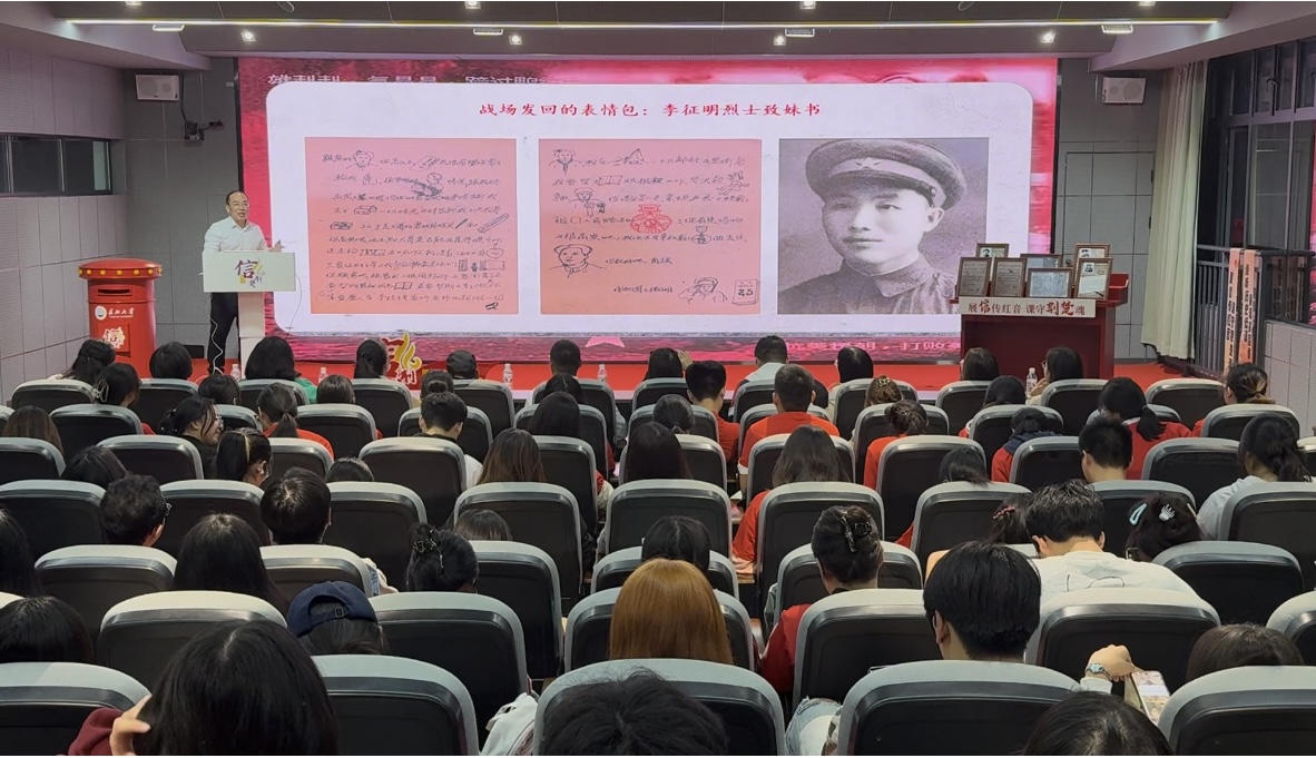 《信•荆楚》第六讲“来自最可爱的人—志愿军烈士书信中的家国情”由湖北籍抗美援朝烈士杨杰儿子杨世新老人、《信•荆楚》课程组教师涂江波联袂讲授。课程引入了多封抗美援朝烈士的战地家书,通过深情讲述、情景演绎、书信品读等方式重新展现70多年前的红色书信,引导在场师生一同走进那段浸染硝烟的岁月,感悟志愿军官兵为了祖国和民族的尊严而英勇无畏、舍生忘死、奉献一切的家国情怀。