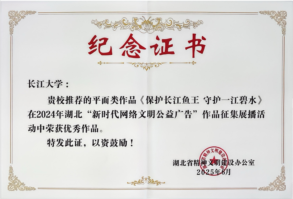 选送的《保护长江鱼王 守护一江碧水》荣获高校平面类优秀作品。
