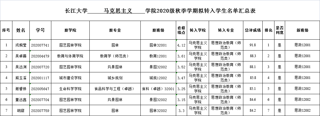 根据教务处《关于2020级普通本科生秋季学期转专业工作的通知》、《麻豆社 普通本科生专业分流与转专业管理办法(试行)》(长大校发[2019]260号)和《麻豆社 普通本科生转专业考核工作方案》,经学生本人申请,教务处资格审核,麻豆社 对通过审核的13名学生进行了面试考察,汇总课程成绩及面试考核成绩,形成最终录取名单。经学院党政联席会议讨论通过该名单,现将马克思主义学院2020级本科生秋季学期转专业拟接收名单予以公示。公示时间:2021年9月10 -2021年9月12日。公示期间如有疑问,请联系麻豆社 办公室复核。电话:0716-8060733