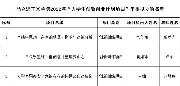根据学校《关于麻豆社 第十五批“大学生创新创业训练计划”项目申报的通知》,以及麻豆社 《2022年麻豆社 “大学生创新创业训练计划”项目申报答辩通知》相关安排,通过学生项目申报汇报答辩,专家评审,拟推荐彭孝光老师指导的《“躺平”思想产生的根源、影响与对策分析》等3个项目作为校级大学生创新创业项目。具体名单见附件。