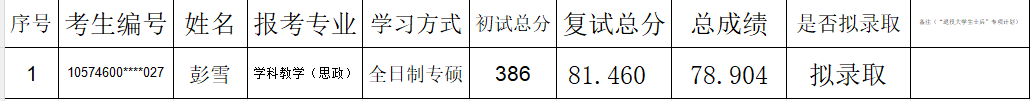 又新增全日制专硕招生计划1个,现从递补拟录取考生中依次拟录取,现将拟录取考生的复试成绩及结果予以公示,复试成绩及拟录取结果如下。