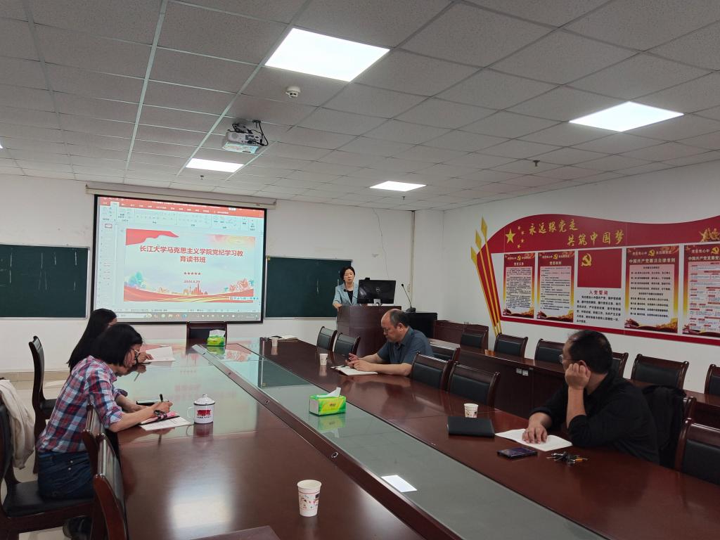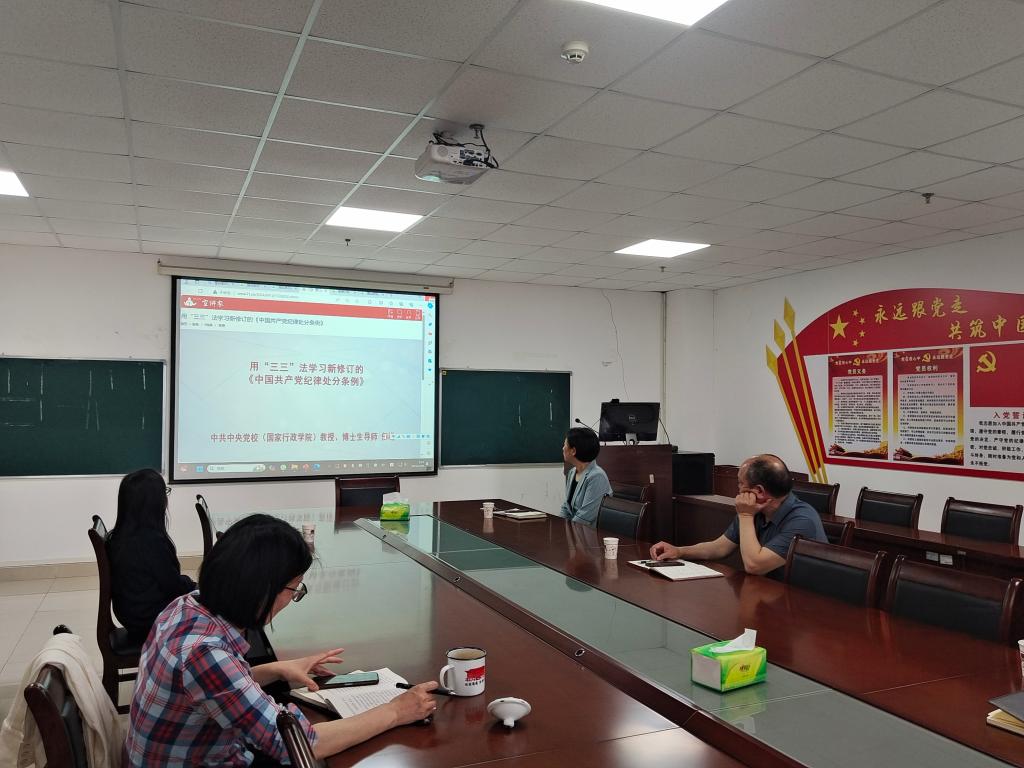 在文科楼1104室举办党纪学习教育读书班,学院党委书记刘小燕围绕学习贯彻《中国共产党纪律处分条例》(以下简称《条例》)作辅导报告,全体院领导参会。