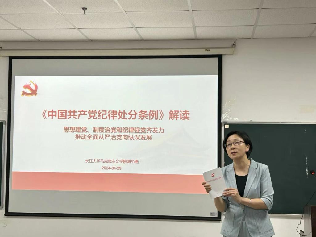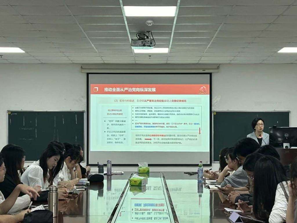 在文科楼1104室举行党纪学习教育专题党课。学院党委书记刘小燕为全院学生党员、入党积极分子授课。