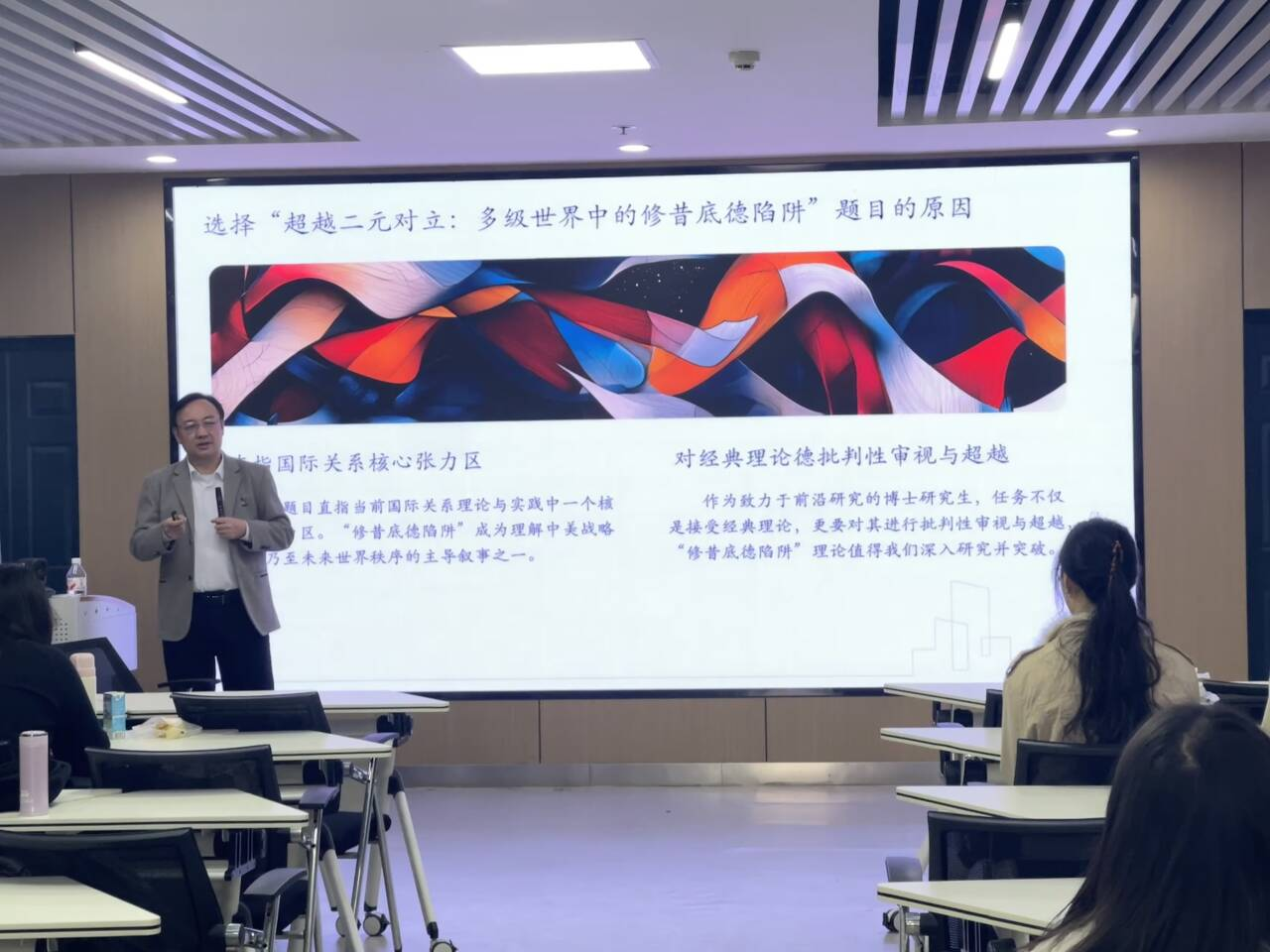 何章银教授作题为“超越二元对立:多级世界中的‘修昔底德陷阱’”的报告,40余名研究生到场参与。