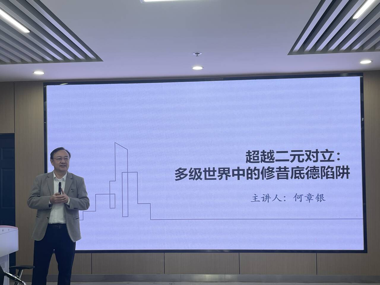 讲座伊始,何章银教授以“结构”为框架展开分享,先抛出“传统‘修昔底德陷阱’理论能否解释当下国际互动?”的问题引发思考,随后分三层解构议题:从理论根源剖析“修昔底德陷阱”的二元权力内核及局限,以多极化现实论证二元叙事的失效,最终提出以“复杂性理论”重构认知的思路。他结合中美关系案例,具象化展现当前国际互动“竞争-依存-合作”的交织状态,强调传统二元对立逻辑已难以覆盖现实的复杂性。