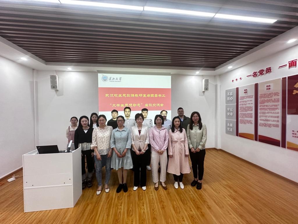 (通讯员杜云素)4月23日,武汉校区思政课教研室与校区团委学工联合举行“大学生思想动态”座谈会,并进行了一场“讲生” “讲心”集体备课会。会议由教研室主任何章银与团工委书记荆鑫共同主持,特邀嘉宾有油工学院辅导员周丽薇、地物学院辅导员谭辰阳、地科学院辅导员姚佳、资环学院辅导员郭政、艺传学院辅导员刘庸。武汉校区思政课教研室教师杜云素、邓亚中、庄蕊蕊、刘雅、赵雷、郭永珍、谭梦媛等参加了此次活动。