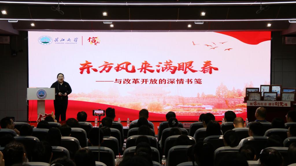 青年教师孙萌和国家级荆州经济技术开发区滩桥镇党委副书记唐王维联袂讲授,课程通过深情讲述、信物分享、情景演绎、红歌合唱等丰富形式解读荆州改革开放中的信物及书信。