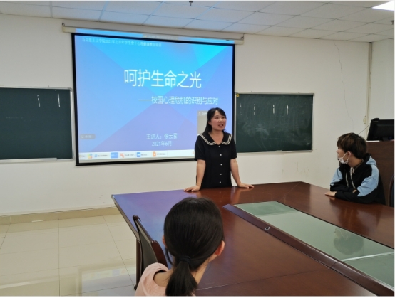 张老师主要从“感知生命的意义——认识生命的价值”、“应对生命的挑战——识别心理危机”、“呵护生命微光——助人与自助”三个方面进行了系统讲解。她通过生活中的事例引入,展现出生命的价值与意义。再从“心理健康的人是什么样子的”、“大学期间常见的心理问题”、“大学生常见心理障碍——抑郁症、精神分裂症”、“从心理问题到心理危机”和“出现心理危机的原因”五个方面进行了详细的介绍,讲解了如何判断一个人的心理健康是否出现了问题,提醒学生干部要提高观察力,善于发现危机线索。引导学生在出现心理危机时学会如何自救和求救。同时也强调了身为学生骨干的工作职责和任务,需要增强责任感。