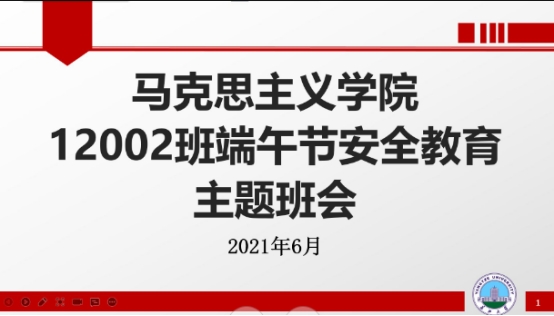 6月8日,思政11902班于13教B210开展端午节安全教育和四六级、期末考试考风考纪主题班会。主持人高美慧、刘博雅分别就一系列安全常识教育、诚信考试专题学习、警示教育和疫情防控教育三方面进行讲述。