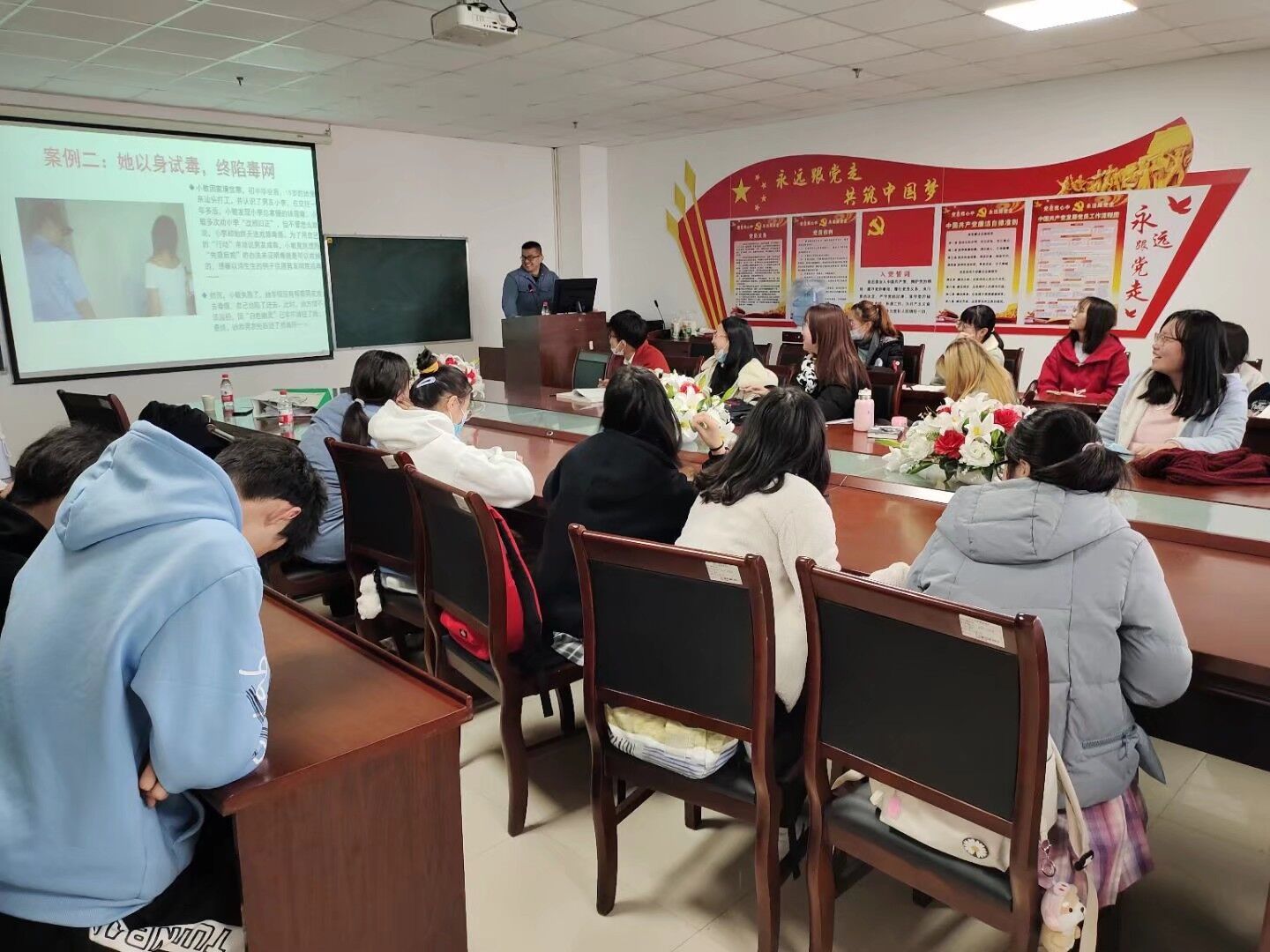 在宣讲前,文老师为同学们介绍了大学生安全教育类别,随后他帮助同学们明确了什么是毒品,并分析了当代社会上发生的数起毒品案例,使同学们更加认识到毒品的危害性,它会磨灭人的意志、毁坏人的前途。随后他进一步分析了大学生接触毒品的诱因,引导大家思考如何拒绝毒品,保护自己。