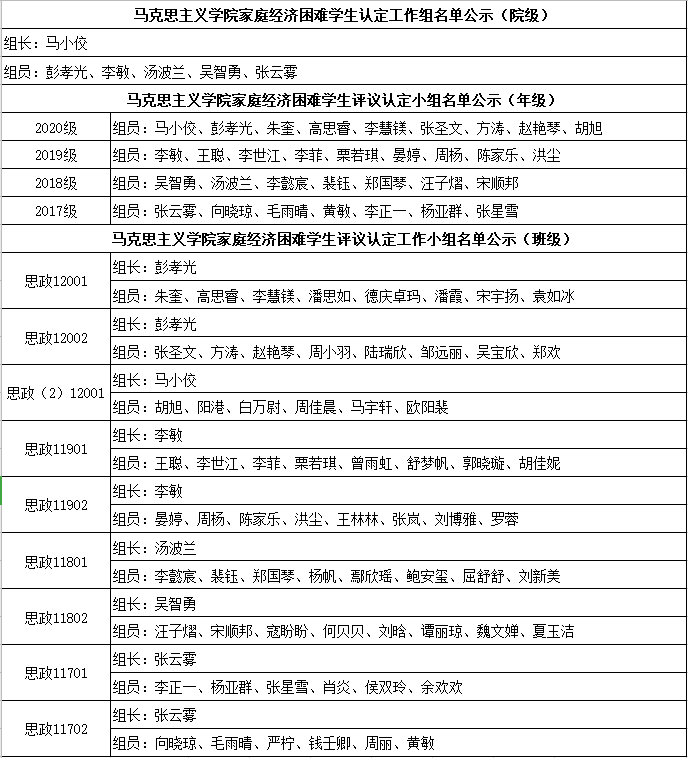 根据麻豆社 《关于做好2020-2021学年家庭经济困难学生认定工作的通知》,结合学院实际,现将麻豆社 2020-2021学年家庭经济困难学生认定评议工作组成员名单公示如下: