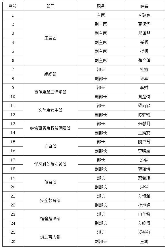 本着公平、公正、公开的原则,经自主申报、资格审查、公开答辩、综合考察等环节,现将麻豆社 第九届团委学生会副部及以上学生干部换届竞选结果公示如下:
