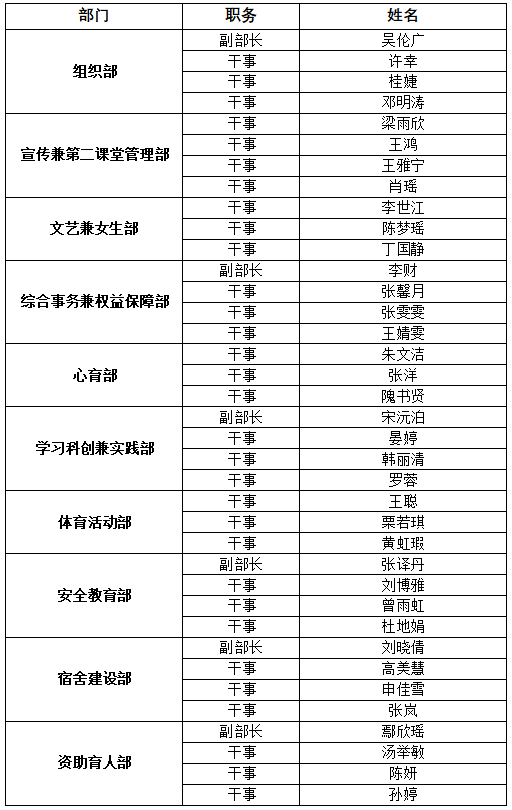 本着公平、公正、公开的原则,经自主申报、资格审查、公开答辩、综合考察等环节,现将麻豆社 第八届团委学生会招新竞选结果公示如下: