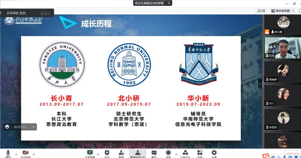 2017届本科毕业生,2017年至2019年就读于北京师范大学,现为华南师范大学信息光电子科技学院的辅导员。在一个半小时的交流中,匡老师分享了他从“长小青”到“北小研”再到“华小新”的成长故事。他以自身经历勉励新生要善于认识自我,及早定立目标,持之以恒努力,以更加昂扬的姿态融入大学生活,全力以赴向着自己的目标前进。听了他的分享后,新生还意犹未尽,纷纷在线提问,探寻学长成功的秘诀。