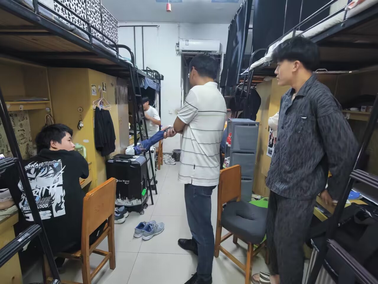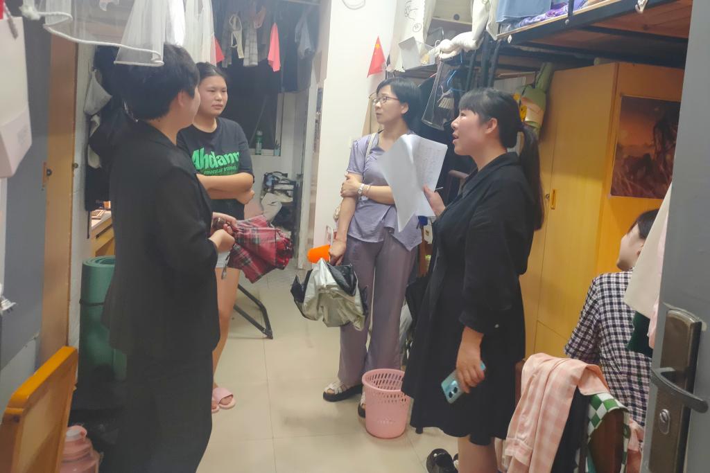 在低年级学生寝室,刘书记详细地询问同学们在生活和学习中是否遇到困难,并给出有效建议。在研究生宿舍,涂院长叮嘱同学们要注意寝室安全和卫生,调整心态更好地投入到学习中,他强调室友之间要和谐相处、共同进步,建设文明寝室。
