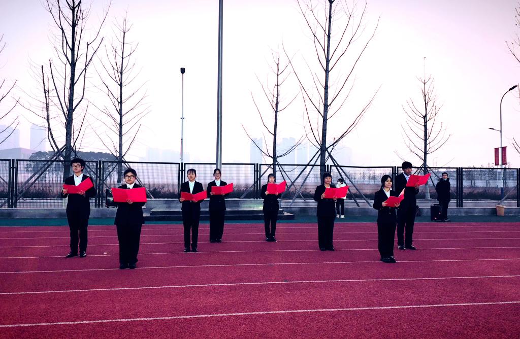 于12月25日早上7点在东校区新田径场举行升旗仪式。学院党委副书记汤慧珍、辅导员张云雾以及全院学生参加仪式。