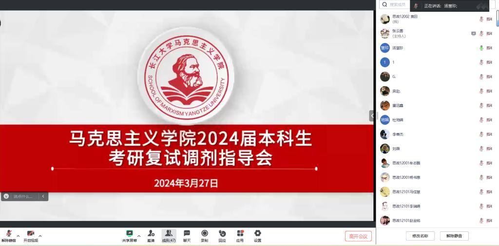于3月27日晚通过线上方式组织了考研复试及调剂交流会,邀请往届优秀研究生作指导分享。学院党委副书记汤慧珍、辅导员张云雾及2024届考研学生共同参会。