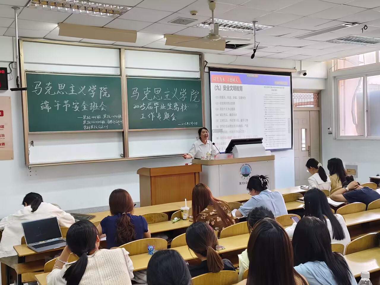 于近日组织本、研各班级开展了端午节前安全教育主题班会。学院党委副书记汤慧珍、学工办主任张云雾以及全体班主任参与其中。