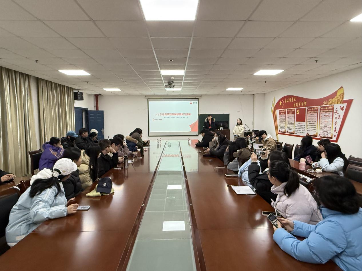 于文科楼1104教室隆重举办人才引进专项政策解读暨复习规划讲座。本次讲座特邀荆州新文道教育资深讲师陈雅倩老师主讲,学院辅导员邓鹏老师及50余名研究生共同参与。