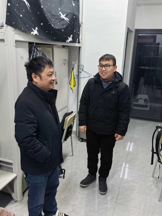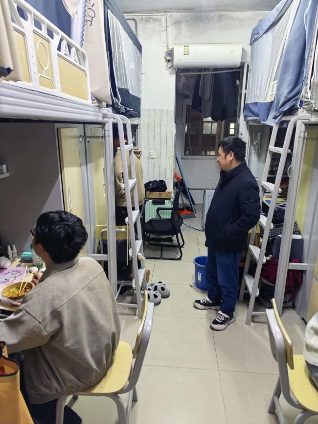 研究生辅导员邓鹏老师深入学院本科及研究生男生宿舍开展查寝走访工作,重点排查宿舍安全隐患,细致了解学生生活近况,切实传递学院对学生的关怀与重视。 走访过程中,邓鹏老师逐一检查各宿舍的用电安全、卫生环境及物品摆放情况,重点排查违规电器、私拉电线等潜在安全风险,现场提醒同学们严格遵守宿舍管理相关规定,进一步增强安全防范意识,自觉养成良好的宿舍生活习惯。