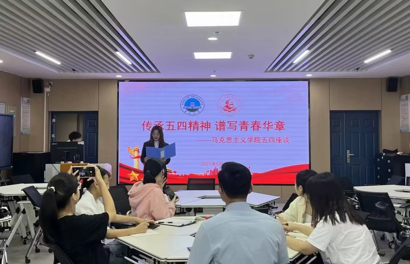 在文科大楼1008会议室开展纪念五四运动104周年青年座谈会,学院团委书记李敏及学生代表参加座谈。